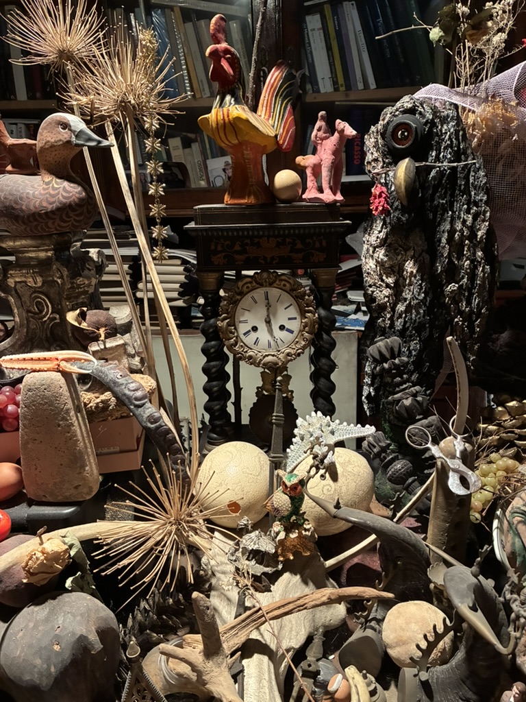 Qui il tempo è l’elemento dominante, quasi la materia prima. Lo si percepisce nella sequenza di tele accatastate secondo un ordine cronologico che racconta un’intera vita di ricerca, nelle pile di oggetti che si affollano sulla scrivania come appunti silenziosi, nei ricordi dell’artista che riaffiorano e si mescolano al presente. Il tempo si manifesta con particolare evidenza sul bancone all’ingresso, dove oggetti di ogni genere sono stati ammassati apparentemente senza criterio, appoggiati l’uno sull’altro nel corso di decenni, fino a formare una stratificazione che è insieme caos e memoria.